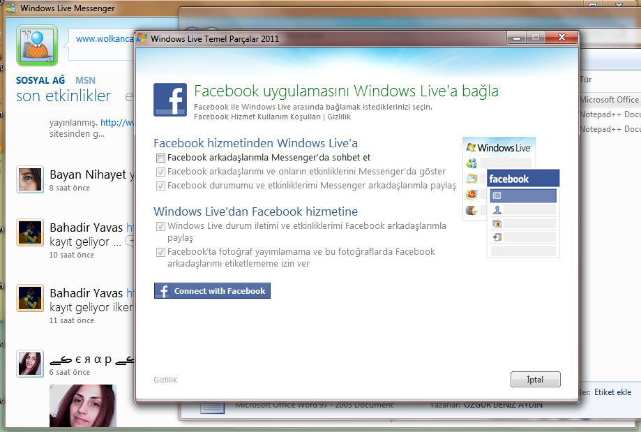Facebook ile Msn’i bağlamak çok basit aşağıdaki ekran görüntüsünde ki gibi bağlama yapılıyor.